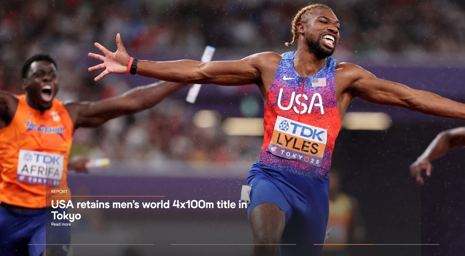 USA clinched their 10th world title in the men’s 4x100m, clocking a world lead of 37.29 to bring track competition at the World Athletics Championships Tokyo 25 to a close on Sunday (21).